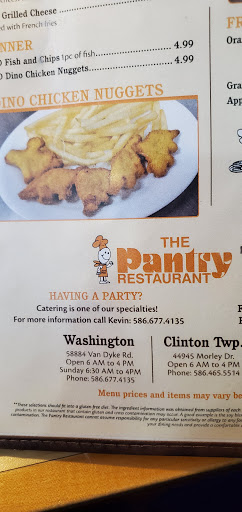 Ive worked in a lot of kitchens, repairing the HVAC equipment, walk-in coolers, water heaters, etc. Im pleased to report that The Pantry Restaurant has the cleanest kitchen that Ive ever seen. The only other kitchen which compared to the Pantry, regarding cleanliness was Dollys Pizza on 25 Mile Road and Van Dyke, but that business is no longer there. Having seen what goes on in many kitchens, I dont eat out much, but, I absolutely have no reservations going to the Pantry Restaurant in Washington Township. Besides the fact that the kitchen is very clean, the food is fantastic and the owner works with his family. They are very friendly and good people. Washington is lucky to have them!