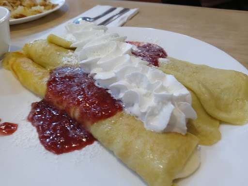The oven puffy pancakes here are legendary. I enjoy the savory vegetable cheese one, not sweet. The strawberry salad was beautiful & delish, if you add chicken, I prefer it warm grilled, not cold.