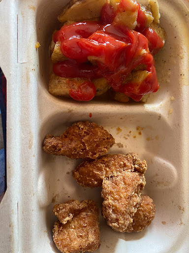 I didnt like much about the food. It was hot, but it was bland and nasty. My chicken and fish was over cooked. The potatoes were ok. Didnt even get condiments or napkins.