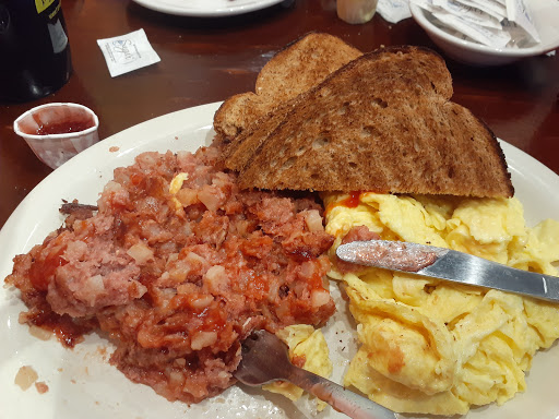The food is pretty good (albeit ridiculously overpriced), but my family refuses to eat at the restaurant anymore, having once eaten there about once a week, after witnessing the way he treated one of his employees after some small mistake she made. If you like breakfast and a ridiculous show, this might be the right place for you...They do like to hide the prices if they can, especially when youre trying to substitute other menu items, for which youll be charged ridiculous fees. On the plus side? Dennys is just a quick trip down I-23 S.