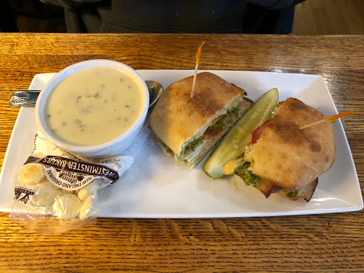Had [fabulous] chicken wild rice soup and their house salad. Husband had ham sandwich. Everything was delicious! Only complaint would be that it was extremely noisy!