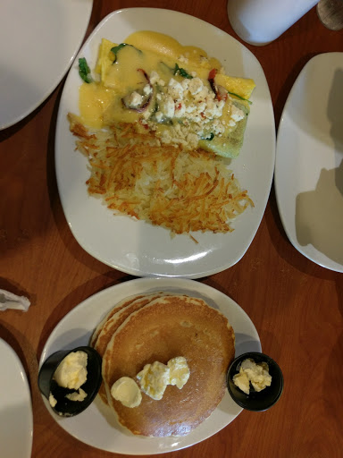 We went there after church on Sunday, arrived about 12:15pm, got seated rather fast considering the crowd but then waited 15 min to get at least coffee and place order, another 35-40 to get our food. Omlet plates were ok, could be warmer though, at that point we just wanted to eat ASAP and leave. Our server was new and clueless, plus some kind of bad situation in the kitchen after morning staff left at the end of shift. Go early morning - we got much better service with Laura (server) at 9am - or just go somewhere else after 12pm on the weekend.