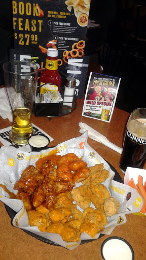 It was a Saturday afternoon and BWW was close to full capacity. We sat at a high top table in the bar. Within minutes Megan, our server was there giving us menus. She was very efficient giving us samples of beer and BWW sauces. Very impress with the teamwork Megan had helping her. I do think the prices are high on the beer. Especially when BWW have competition with other bars and breweries in the area.