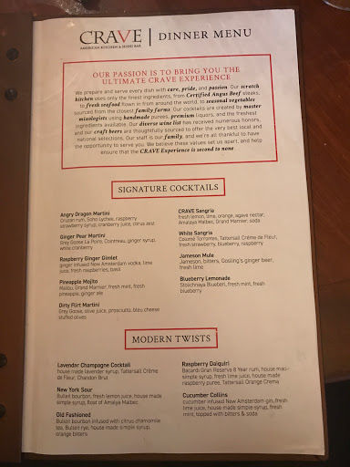 I really hate to say negative things about a restaurant; however, my spouse and I went to Crave last Friday night and had a very poor experience. First off, we had called ahead to be put on the waiting list (as we were on our way). When we arrived, our names were nowhere to be found. By this time, the waiting list had mostly dissipated so we were able to sit down quickly. We sat down, looked over the menu and discovered an appetizer that we wanted to order prior to our entrees. Our waiter came and we placed our appetizer order. We stated that we still would like to look over the drink menu and entrees. The waiter stated that he would be right back for our order. Well.....30 MINUTES go by before our waiter comes back to our table! Another server brought our appetizer (which was finished by the time our waiter returned). Our waiter walked by us several times without stopping or even making eye contact. We were so frustrated with the service that we paid for our appetizer and left. The waiter NEVER apologized for his tardiness. Very disappointing!