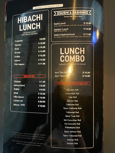 This review is based on the sushi and not the hibachi. Not one of the best sushi places, but its one of the better ones around the Bloomington area. They have a good selection of specialty rolls to choose from so thats a plus. Its best to go a couple hours before closing since they have up to half-off rolls. My girlfriend and I still have to try out the hibachi and will probably try it out soon. If you are in the area, give it a shot.