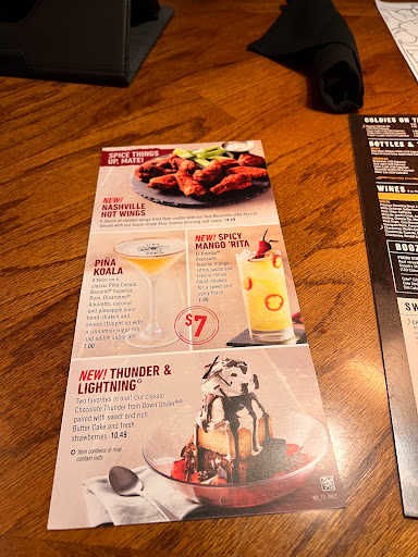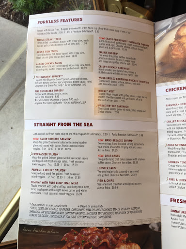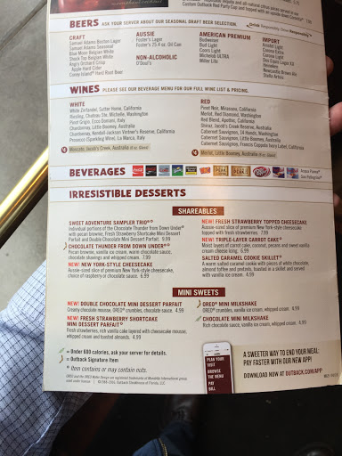 First outback trip ever! The parking lot was packed but we were able to sit at a hightop at the bar immediately. Our server Riley was very friendly and attentive, I would say remarkably attentive considering how busy the restaurant was. He was awesome. Our food came out incredibly fast and I really enjoyed it. I will give two negatives -- I ordered the Wallaby Darned cocktail which was tasty but the ice was too coarse making it really hard to drink. I also didnt care for the dippin sauces provided with the appetizer and my entree. My steak was perfectly cooked. I dont normally eat shrimp but it was really good. The Bloomin Onion was done really well but there were only two of us, that was way too much for two people -- but like I said Id never been here before and wanted to try the main attraction. Overall my experience was really good. Id give four and a half if I could but since thats not an option and I feel like its not fair to go lower, five stars from me.