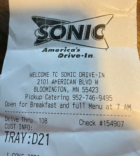 Stopped for lunch on 02/07/16, several car hop spots will filled, we pulled into one, got our order together and when we tried to order we were told it was Drive Thru only, even though there were car hops out serving other vehicles. Looked at the length of the line and if you figure about a 10 minute wait for made to order food, we were looking at 60 minutes plus in line....needless to say McDonalds got our order that day. We enjoy Sonics a lot but it would have been worth driving to the Savage location where weve never had a issue. The Bloomington one is less to be desired which is kind of sad. On such a decent day in MN and not to be offering car hop service is pretty poor customer service.
