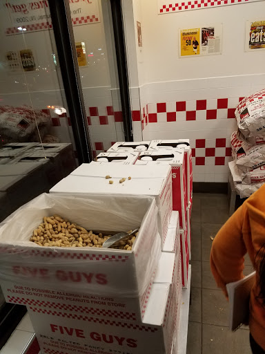 One of my FAVORITE burger joints! Fresh, tasty, fries are delicious and the peanuts are good! Plenty of parking and space! Downsides? Prices are a bit steep (in my opinion). No dessert options (e.g. shakes), but thats not what Five Guys is about.