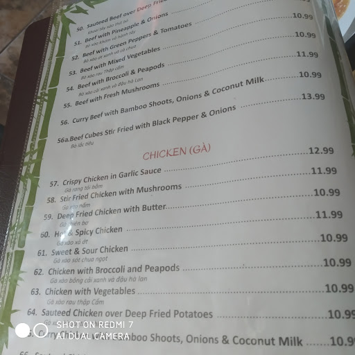 This was the most horrible, awful experience at a restaurant I have ever had. DO NOT GO HERE! The waitress never smiled once. I asked if they had Kung Pao Chicken, and she told me NO, even though they had a picture up on the wall showing it! She stated that its a Chinese dish, were a Vietnamese place. I asked for an extra side of rice, and the rice they gave me had a very distinct burnt flavor, like it had been sitting too long in the cooker. The dish also only had four small pieces of chicken in it. This dish cost almost $11.00. I can get twice this much food for the same cost at other places. So I went back, and kindly explained the situation and asked them to replace it. They refused, told me to go home and get my old dish and bring it back to prove it, that I was lying. Also, when I did talk to the waitress, I asked her if she didnt enjoy her job. She stated its a family business, and shes been there a long time, and it gets old after a while. I told her that a positive attitude goes a long way. She still didnt smile. Dont go here, ever. Trust me. I have never once in my life had a place tell me that Im a liar and refuse to replace something. Theyre never getting my service again.