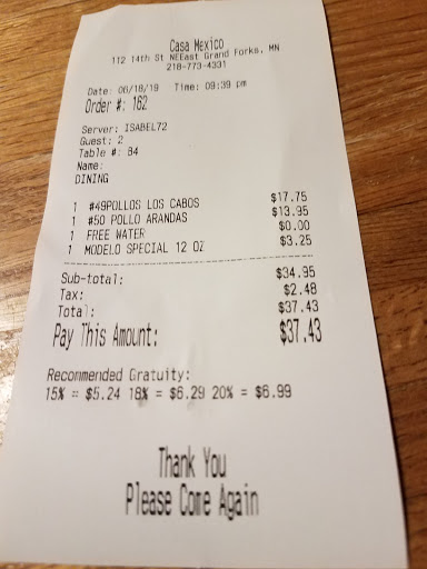 After complaining sadly that the local Taco Bell was the best Mexican food in Grand Forks, North Dakota, a friend recommended we try something different: cross the river into East Grand Forks! They told us about Casa Mexico, and off we went. Is it as good as youll find in a Los Angeles barrio hole-in-the-wall? Well, no, but thats an amazingly high bar to set for Mexican food anyway. Its an easy 3.5 stars to 4 stars compared nationwide for Mexican, and easily 5-star for this region of the country. Most importantly, it is closer to authentic than any other place save perhaps somewhere in Fargo/Moorhead that we dont know about. Our family LOVES good, authentic Mexican food, and this is as close as were going to get for - possibly - hundreds of miles. So, yeah, this is now our go-to place for Mexican in the "Greater Grand Forks" area.