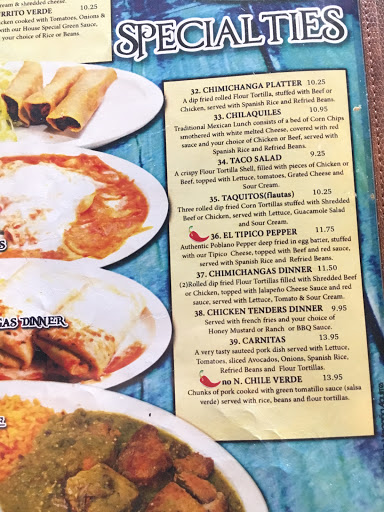 Food is really, really, yummy! Best Mexican Ive been to so far in this area. The salsa they serve with the nice warm chips, is amazing! I could eat that salsa by the spoonful! LOL... Only complaint is Id like to see more plates available with more combinations. Plates with three or five different things. 1 taco, 1 burrito, 1 tostada, 1 chimichanga, etc. Great place, good service though!