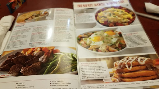 They have good good food and good service but this location is getting run down. I think the staff is awesome. They all work hard to make for a great experience. The food is always hot and most of the time its pretty fast. One thing that kind of bothers me. They have great pancakes but the syrup is served cold. It would be better to serve it hot like the competition. This location is getting run down. The fabric on the corners of the booths and the back of the chairs is filthy (see photo) this is a real turn off. The vents above the booths along the windows are covered in mold and theres a square vent directly over one of the center booths that is absolutely black with mold. The bathrooms are very dated and the mens room is usually dirty and reekes! Today there was urine all around the urinal. I recently saw an employee walk from the kitchen to the mens room with a mop. How can you wash the floor without a bucket to rince the mop a few times? Come on! Take some pride! Ill be happy to update this review if I see improvements but its just too dirty and rundown to to warrant more then two stars.