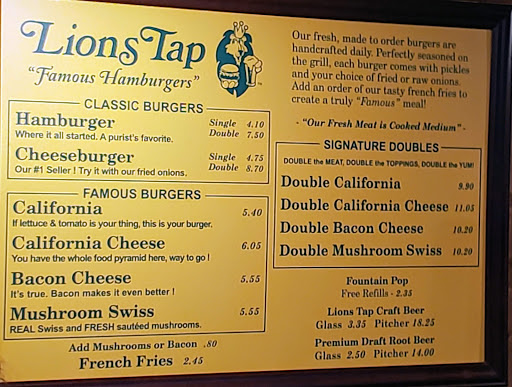My family and I have been coming here for years. Dont pay attention to the reviews that state the burger is "undercooked" and that the servings are "small" and "overrated". The simplicity of presentation speaks for itself. The burger doesnt need any fancy dressings, or hoity toity fries. The deliciousness of the patty stands up on its own, and speaks volumes about the quality. The simple crinkle cut fries they offer, only compliment the mouth watering burger. Any toppings other than a tomato, lettuce and pickle would detract from the pure goodness of the patty. The meat is fresh, and perfectly cooked to order if you truly know the difference between the meat tenderness scale. The service could use some work now and then, but for the most part, its an establishment that thrives on efficiency. If you come in with that understanding, then you wont be disappointed. The menu, once again is simple and direct. You can be in and out in less than 30 minutes if youre in a hurry. Ive tried to find a place that comes any where near the goodness that is Lions Tap, and I still have not found it yet, and I dont anticipate to EVER find it.