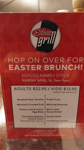 The Edina Grill has a nice variety of dishes and price points. Service was quick and friendly. The serving "dishes" were these foo-foo type vessels that were a cross between a plate and a bowl, tilted at a 30 degree angle. As a result, all 3 of the main ingredients of my dish mashed together, which is not always desirable. Please dont overcomplicate the eating experience.