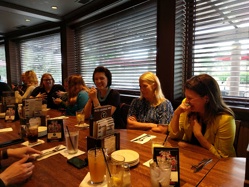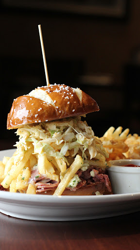 I have met my extended family at this establishment several times now as it is centrally located from where we all live. The food is nothing to write home about. Adequate would best describe it. What positively horrible is the service. There really is none. Meals come out whenever the kitchen gets around to it and the servers are rude and ineffective. Last night I had the root-beer pulled pork sandwich with deep fried pickle chips. The pork was dry and anything but "stacked". It was mostly a pretzel with some pork and what appeared to be a dollop of root-beer BBQ sauce. The pickle chips were cold as were all the fries and onion rings that were served to others at the table. It appears the group that goes there for happy hour on the patio understands how best to use this establishment. Have drink and go home. Skip this place unless you love being treated like crap by servers and you adore very mediocre food.