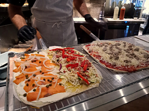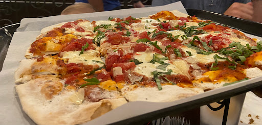 Quality ingredients with a bit of a different type of cookie sheet pizza. Pizza and salad are tasty, with a nice varied selection of beer and wine.