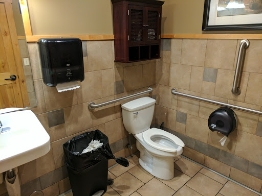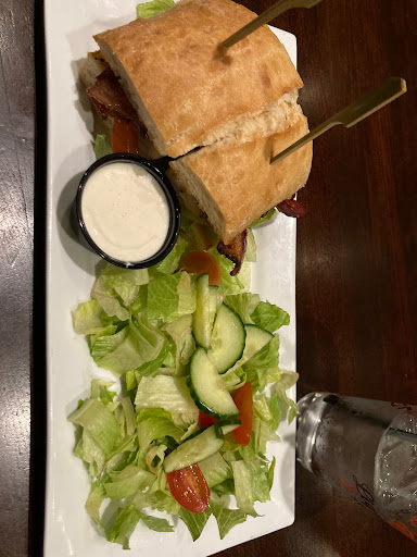 Driving up from Minneapolis, desperate for lunch, I spotted their sign and was intrigued by something slated a "grill & market". I went into the market side first and found a narrow little deli stocked with Boars Head meats and cheeses and organic milk and organic eggs. They even had olives and classy little pasta salads. I asked the man behind the counter if they made sandwiches, he said yes, on the bar and grill side, but he could make me a cold deli sandwich. I politely demurred and crossed back to the Bar & Grill. Its a small room with perhaps ten tables, a discreet half wall fireplace protects the diners from door drafts. A sweeping arch of gleaming cherry wood makes a classy bar behind which are two large flat screen television busily indoctrinating America. The order window for the kitchen is at one end of the bar near the registers for the wait staff. I was greeted by highly competent wait staff, friendly without being perky. She promptly ordered me up a roast beef and provolone sandwich, with fruit instead of french fries. I trotted off to check out their facilities. Rate that a 9. Clean & bright with automatic sinks and a foot operated garbage can. An automatic toilet would have given them a ten. When I returned I waited briefly while the waitress set me up with a diet coke and my bill. I paid and minutes later my food arrive. Wow. Piled slices of roast beef, juicy and flavorful, topped with perfectly melted provolone and scattered all over with crisp red peppers and onions which had been just seared enough to bring out their flavor. The whole thing was on a sourdough baguette, toasted perfectly on the outside and warm and soft in the center. A giant spear of pickle divide this culinary beauty from freshly sliced fresh apples (no edges of core) and sliced oranges previously denuded of their rinds.I started salivating immediately. And it tasted as good as it looked even though I had to eat and drive. I also left with a take out menu (listing T-Box Chili, Watercress Waldorf Salad, Jucy Lucy, Capelini Capresse and a Jamaican Jerk Pizza) and the firm conviction that I would be back. Ill leave that fifth star blank until I return, since Im not sure what their Colorado bulldogs are like.