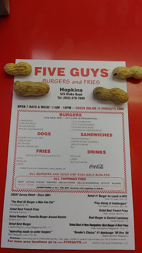 Well, with all of the rave reviews, we expected something special, instead there is only one good thing we can say, and that is the fries were good, which is why we give it two stars. First off, they dont have gluten free buns. This means the millions of people who suffer from gluten or wheat intolerance cant eat here. However, they did offer a "lettuce wrap", which Jimmy Johns offers also, with very good results. 5 guys did offer us a lettuce wrap as well, however, they were conveniently out of lettuce wrap, seriously. Next, they cook their burgers well done, no options. This is because like most other restaurants, the beef is from animal factories (CAFOs) which can and do get ecoli, and other bacteria in their beef, therefore the need to cook it until it has no flavor or juice. We got a "burger bowl", which is without a bun, and we have gone bunless before, typically without issue. However, they got the order wrong- twice, no sorry, no comments, just had to wait an extra 15 minutes, and then literally, watch them throw our order into a bag. The burgers had a horrible after taste, which is also typical if the beef is not refrigerated properly or stored uncovered with other foods. Needless to say, the only thing we ate were the fries and peanuts. We often eat at Mainstreets, which offers grass fed burgers, cooked medium as we like them, and great fries. They dont offer gluten-free buns either, but the burgers are large, juicy, and good, and the bun then would simply be too much. We wont be back to 5 guys.