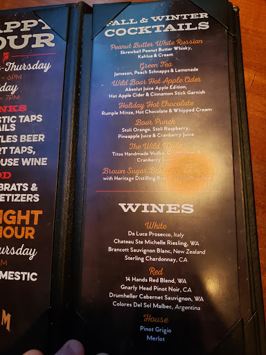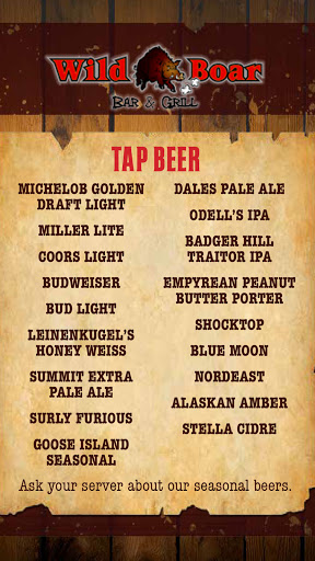 Dinner and Drinks at the Wild Boar was a great experience overall. I was there on a Saturday during March Madness, so there were families and sports fans there alike. The place is huge - plenty of seating options to accommodate any sized party. Saturdays special was All-You-Can-Eat Fajitas, a pretty good deal at $14.99. Drinks are priced fairly and their large steins of beer were great. Plenty of TVs to catch the game. I ordered the Fajita Burrito with chicken and it was pretty good. It was a little heavy on the black beans, but had good flavor overall. One of my complaints was the staff behind the bar did not seem to get along. I caught myself many times eavesdropping on the bartenders and it was obvious that two of them did not like the other one. In any place of work, it is important to put on a good facade for customers. Also, for some reason Antiques Roadshow was on one of the TVs during the NCAA Basketball Tournament...