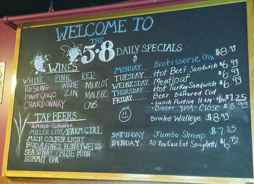 In the past the 5-8s food, and service, has been very good. Lately, they are slipping in food and service. Our cheese curds and onion rings were lukewarm. We we told they are using a different cheese and they werent hot and crisp. After finding a seat; the wait time was very long. They had only "1" waitress in the bar area. (We usually dine one the side away from the bar.) The management should have had more servers. I will try to write a followup review the next time we visit 5-8. Hopefully, there will be an improvement.