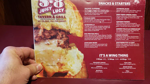 Juicy Lucy! I dont care what all you heathens say, 5-8 is the home of the Juicy Lucy, and its fantastic. They come in multiple varieties (cheddar + bacon, marinara + mozzarella, bleu cheese, etc.), as well as a Saucy Sally (which, as far as I can tell is a regular Juicy Lucy dressed up like a Big Mac, with a tasty sauce). They have other stuff, too (open face turkey sandwich, meatloaf stacker, etc.), but if you get anything but a burger youre doing yourself a disservice. Atmosphere is what youd expect for a local bar + grill, right town to the townie clientele. But if youre looking for a beer and a burger, you want to try this place.