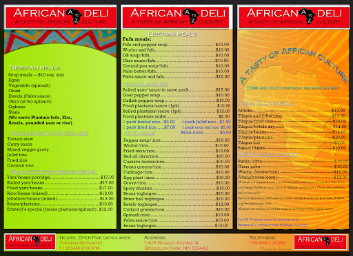 This food is over the top amazing! I & my fiancée had our first outing ever at this restaurant and we are getting married next year. African Deli is our favorite go to spot - the jollof rice is to die for! Spicy and delicious - the customer service of the husband/wife owners is A+. Tough luck if you dont reside in Mn like me but be sure to check it out if you are in Minneapolis.