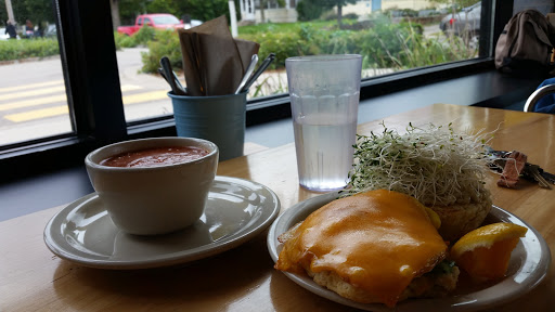 I absolutely love this local cafe. All the foods are made from scratch from local farms & sources. They have a homemade breakfast buiscut to die for. The butter buiscut is fluffy & always fresh, comes with egg, avocado, sprouts, tomato & garlic spread if you like. Delicious bakery, just tried their Rhubarb cheesecake & great coffee too....ALL Yum! Very affordable. Great bright atmosphere with wood plank tables and a little nook for kids. Sunny outdoor seating available too, when weather permits. Very welcoming and always accomidating service. One of my fave places for brunch...