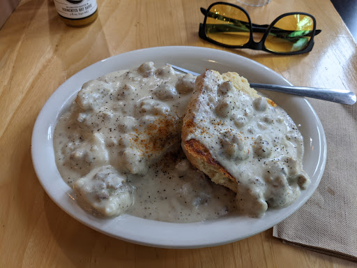This was the first and last time we will ever go here. We ordered biscuits and gravy with a side of bacon, added two scrambled eggs, an order of the huevos burrito with sausage and two vanilla lattes. They must price their food by the minute because we waited damn near 25 minutes for that one order which came to $25. There were flies ALL over in the cafe!! They were in the pastry case flying around and landing on the scones, cupcakes and bars. The flies were on tables, in the windows, and in the kitchen. The kitchen was unsanitarlily dirty. Not to mention the food was riduliously awful! The burrito was OK but the biscuits and gravy were disgusting! However, the lattes were creamy, smooth and delicious! Me and my fiance each ordered a latte. Mine was brought to me, my fiance had to go back up to the counter to get his. He was the only black person in the cafe. I would have liked a pastry but had to pass due to watching the flies in the pastry case. NEVER gain will we visit this establishment. The complimentary eclair ticket I was given was handed to someone else outside because we wont be back.