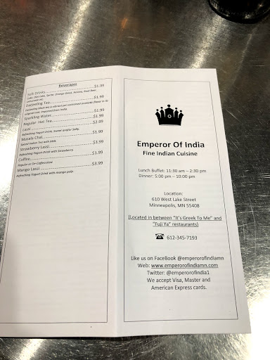 5/31/2017: Buffets are tough to get right but but they do it right here. Vegetables are often squishy at buffets but theyre done perfectly at the Emperor with very good flavors. The spice levels are what youd expect (mild) so you wont get blown away and you get a big basket of naan which is perfectly done. Flavors are legit and service is fantastic. 5/30/2017: Take out was freshly & quickly prepared w/ very nicely blended flavors. Portion sizes were on the large side. I noticed they have a lunch buffet at 11:30 on weekdays. I really hope they can make it in this location as others have been unsuccessful.