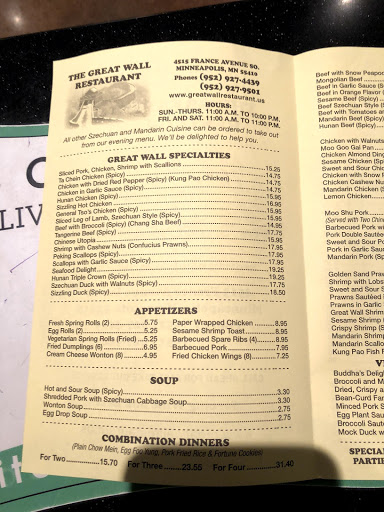 Hands down the best in town. My family and I have been coming here for almost 25 years. The owner, Andy, has watched me grow up. This may be the only restaurant that Ive never had anything bad ever come to the table (or in a to-go). Felt inclined to write a review and let people know that if you want the most bomb Chinese food in all of Minneapolis, come to the Great Wall!!