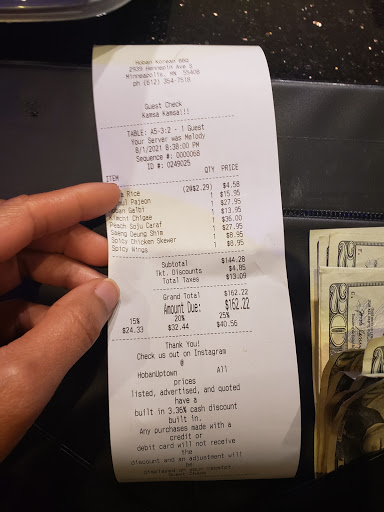 Recently went to Hobans in Uptown. There were good things about the visit and also not so good things. We started by getting seated and had our beverage orders. Had an attentive young man as a server to start but then they switch to a female server. She took our order and we waited. It was on a Saturday evening so there was a little wait for the food but not unreasonable. We did have to wait for a while and flag someone down to get out water refilled. Got our appetizers (fried dumplings) which were good and at a reasonable price. Ordered the kalbi beef with the bulgogi and a naeng myun. You can judge most Korean restaurants by the quantity and quality of banchan (side dishes) that they have. The banchan that we got was okay but not as diverse as other places. Also the kimchee was not properly pickled. It tasted like it was just made that day without the proper time to ferment. Then we got our primary order of meat but no rice. This is the only Korean place Ive ever been to that charges extra for rice and almost $2.00 per bowel. If your gonna charge $20-$23 doors for a dish, I would think the rice would be included. The Kalbi beef was pretty good with good flavor, some bites were a little tough. The bulgogi was good flavored as well and fairly tender. The naeng myun was bland and tasteless. The noodles were cooked well but there was no flavor to it. At that time, we didnt see our server for a while so it wasnt worth bring it up to her. Finally had to track someone down to get our check and pay the bill. Overall, the experience was okay, considering there are not a lot of alternatives in the Cities to traditional Korean barbecue. Definitely not the best Ive ever been too but also not the worse. The quality of food and service are areas that could be improved. If they did that, this place would be a great addition to the Uptown area.