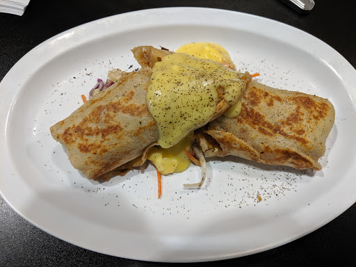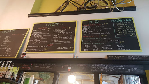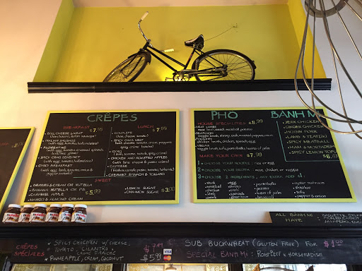 Amazing little place with an eclectic menu. The staff are all French, judging by their accents, and the service is warm, intimate and super fast -- no small feat in a restaurant the size of a closet. There is seating in the lobby of the building next door which gives one the feeling of eating at a sidewalk cafe even in the winter cold! We got the pho and the gyro breakfast burrito. Both were amazing. The coffee is superb. Also on the menu are bahn mi (Vietnamese Sandwiches) and, of course, crepes. Highly recommended.