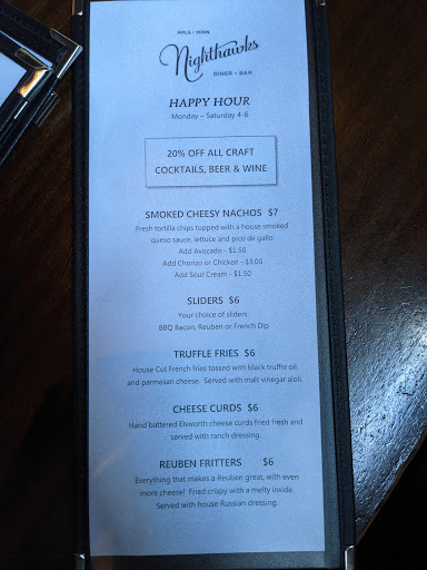 Incredible. Scrumptious. Fresh and comforting. Everything is from scratch! The owners are always there and make sure you are well taken care of. The portions are huge the cobb salad is a paleo monster! Great for kids and families too kids menu even comes with carrots and dip. Friendly atmosphere and great beer selection. The options are well thought out and you can taste each ingredient. Breakfast is fantastic and the pulled pork used in various entrees is some of the best ive ever had and been to Houston, Dallas, Memphis, Atlanta, etc and had bbq at each Nighthawks bbq is some of the best.