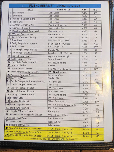 Pub 42 cancelled a reservation of an event for a neighboring business 2 weeks before the event. Gave a sad excuse that it was made with an old manager. The business that made the reservation had already ordered the food, hired a band and invited their guests. Now they are scrambling to find a different venue. Really poor customer service on Pub 42s part. I also work in the area and will make sure we all stop having our happy hours and business lunches here.