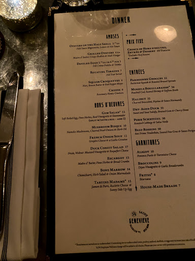 I finally had the pleasure of dining at St. Genevieve after seeing months of rave reviews from local, regional and national media sources. St. Gen is another product of the brilliant mind of Steve Brown - his other famous restaurant being Tilia in the Linden Hills neighborhood. First, the ambiance of St. Gen is warm, intimate, and comforting. Ones eyes are immediately drawn to the intricate bar, that lies at the center of the space. The wait staff is inviting and accessible, but not overbearing - which makes the dining experience truly personal. The food is another reflection of the mastery Steve Brown possess. The french cuisine is refreshing to see in the ever expanding new-nordic focused Minneapolis food scene. I started off with the French Onion Tartine, which was a magical twist on the comfort soup I return to time and time again. For my entree, I had the duck/mushroom/leek special. A combination of some of my favorite foods. The plate was beautifully presented and forcefully brought together through a red wine sauce. While more expensive than most restaurants in the Twin Cities, St. Genevieve is worth every penny and more. Its a true masterpiece and I look forward to dining there again soon - perhaps for brunch.