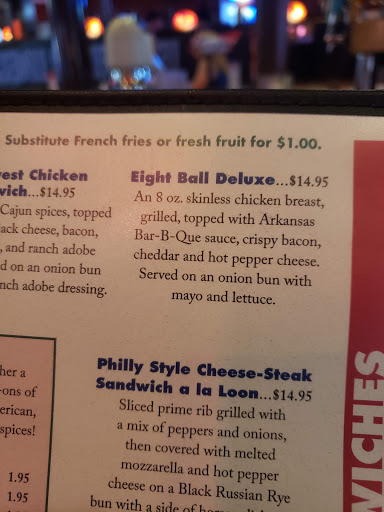 I always enjoy The Loon. Cool environment, good service, decent food for average tavern prices (in most cases, some are more than Id expect). Today I wasnt too impressed with the Phili Cheese Steak...would have been better on white bread. Didnt even think to ask the type of bread...