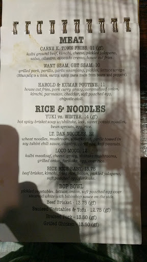A solid Korean fusion restaurant serving up a wide array of traditional dishes with a twist. Good ambience, stellar service, and a modest craft beer and cocktail selection to boot. I had one of the best bibimbaps Ive ever had here for lunch at a great price (they dont do lunch any more :(. The pork belly was a little fatty for me but lets face it- its pork belly after all. The rice was excellent with a great fresh and prepared veggie array and perfectly poached egg. The entire thing was an excellent balance of sweet, sour, and spicy. My mouth is pleased. I can tell that the other items on their menu seem well- thought out and reasonably priced, though slightly more for dinner. A great date spot or hang-out place with friends. This place is less than a year old, so dont let the lack of reviews scare you away! Try some bibimbap and bulgogi for yourself!