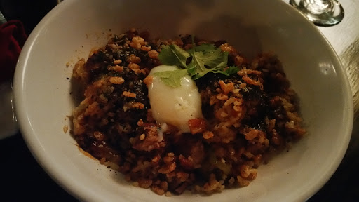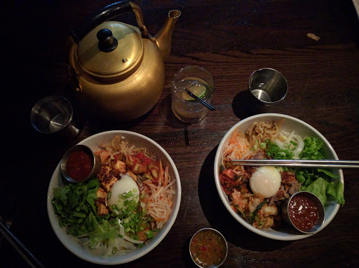 Astonishing food and drink in an unexpected place. First, cocktails: "Alice & The Caterpillar" - Green Chartreuse, Cream, Pineapple, Coconut, Orange. Thats a creamy pink "girl" drink that packs a wallop. "The Rye Back" - J. Carver Rye, Gum Syrup, Peychaud, Absinthe Wash. Just as potent as it sounds. Some of the best cocktails in Minneapolis - not where you would expect them. They also serve a great local beer selection, tea, Vietnamese coffee, and more. Finally, to the food! "Bitter Goat Mandu" - Braised Bitter Greens Fried Dumplings, Whipped Goat Cheese, Pomegranate. A great way to start. "Rice Rice Baby" - Brisket Kimchi Fried Rice, Bacon, Pickled Jalapeños, Crispy Rice, Soft Poached Egg, Furikake. Perfection! I could just go on and on about every dish Ive had there - but this is a hidden gem on the edge of the Midtown Global Market. Its a bit rough in appearance (dark rough-hewn-wood booths) and a bit too dark inside - but the food! The food! And the desserts! In another environment people would pay twice the price for what theyre doing here.