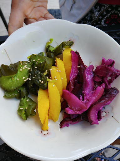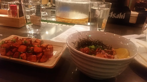 What a great little find! Fun/funky decor and employees. It was busy on a Monday night which was a good sign. Lots of interesting things on the menu, which ranged far and wide across oriental foods. As mentioned on the menu, portions are smallish, perfect for sharing, there are only a few ‘entrees’. I’m not sure I could give you the names of what we ordered, but we did get the edamame, cool and crisp. We had 2 orders of brown rice, which was plenty for 3. We split up the fried calamari, teriyaki salmon, beef with potatoes and some sort of fried chicken pieces. Items came to the table as they were prepared, calamari and chicken arrived first. Calamari was crisp, lightly battered, perfectly cooked—not chewy, which can ruin it. Very tasty sauce with it. Chicken was nicely spicy with a soy sauce based sauce, wonderful. Teriyaki salmon was wonderful and fresh, tangy teriyaki sauce a nice accompaniment. Beef was thin slices, nice and hot, tasty veggies served with it. Nice quick, no fuss service, great prices. A treat!