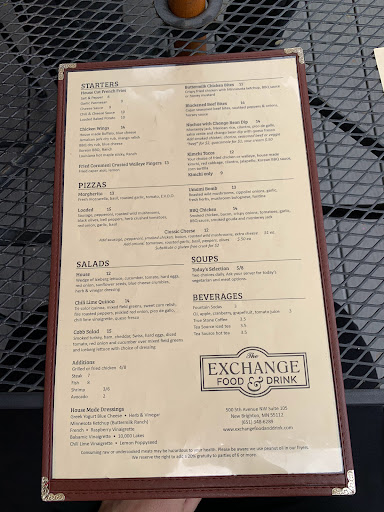 This place is fantastic! If you have not tried their food, you absolutely have to go. They look like your run-of-the-mill bar and grill, but their chef (Kyle) takes great pride in the food he prepares and is a phenomenally talented chef. He has an incredible background working in various kitchens around the Twin Cities and is proud to source as much local food as he can and make everything from scratch, except for the ketchup, because "you just dont mess with Heinz ketchup." My husband and I had the pleasure of hosting our rehearsal dinner at The Exchange the evening before our wedding. We met with Chef Kyle to go over menu options, and Kyle put together recommendations. We were amazed at the options he provided and we put together a 3-course meal that was served family style. Our party of 18 was BLOWN AWAY by the food (see menu attached). We received so many compliments and people were astonished by the uniqueness of the dishes. It was definitely a highlight of our wedding week. Additionally, Im vegetarian, and Kyle absolutely outdid himself putting together creative options that even the pickiest of meat eaters raved about (Mushroom and Tofu wontons and Avocado Egg Rolls were amongst the favorites!). Not only was the food beyond or expectations, but the service was fantastic. Rachel had a table of wine set up and offered guests a glass as they entered. She also ensured no ones glass went empty throughout the evening and was just a delightful addition to our party. Additionally the room The Exchange has available to host parties / get togethers is great. It is private and very spacious, with a big screen TV (we played our wedding slideshow), and a private bathroom, which is great, as guests dont have to use the one in the main restaurant. And Kyle and his team had name cards printed up and put them at table settings as per our request and even had printed menus up of the evenings selections and had them sitting at each plate so our guests could see all the details for all of the different menu items. And for all of this, the value was incredible. I think our guests probably assumed we paid 2-3 times the amount we paid, due to the amazing quality of the food paired with the impeccable service. The Exchange is a wonderful restaurant, and my husband and I are happy to continue to support this establishment for years to come.