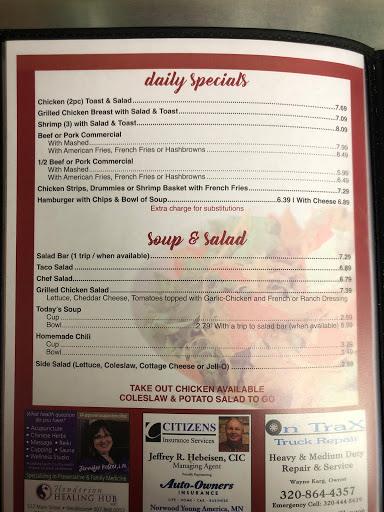 Fair prices, decent service, and average food. Service is a bit faster than Bumps in Glencoe, but the food isnt as good. Atmosphere is very "country" if that floats your boat. Its not a bad place; its just exceedingly average. Its overall underwhelming and Id recommend that you just go somewhere else if its not too much of a hassle.