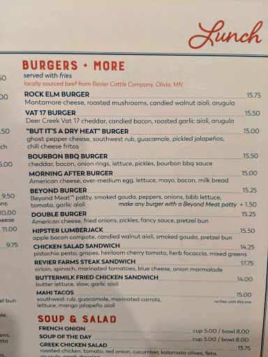 This place took my by total surprise! The aesthetic is modern, slick and clean but steeping with tasteful charm and friendly staff. There is outdoor seating, a bar and a dining room. The beer selection is excellent - especially if you are into the local MN / WI craft scene. The menu is grade-A; there is something for every palette. I ordered the guacamole appetizer, salmon chowder and the bourbon BBQ burger with a side of tots and let me tell you - it was all phenomenal! The service was outstanding and the vibe was friendly and authentic. I will most certainly be a return customer! I highly recommend Rock Elm Tavern!