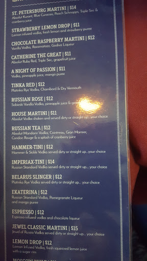 Great martinis, excellent Russian food. Very attentive staff. Perfect neighborhood restaurant, definitely going back.