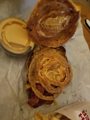 Pre-ordered my burger online for pick up at this location. Had to wait in line for my food. On top of that I paid for haystack onions and asked for sauce on the side. After waiting in line between 5-7 minutes I got my food walked out to my car only to realize there were no haystack onions or sauces in the bag. Walked back in only for them to put the onions in a little container. Food was cold and the sauce was on my burger.... Didnt even apologize, what horrible customer service.