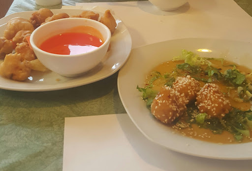We dined in and even though there was only one other family we waited about 30 minutes for our food. Only 2 ppl were working in the restaurant. The woman that served us was nice. We ate Eggs Rolls, Steamed Dumplings, House Fried Rice, and Shimp Curry. Everything tasted average but I personally didnt like the Dumplings. The front door is ultra heavy to push for some reason and the place is small. Maybe its better to order take out.