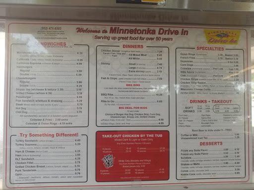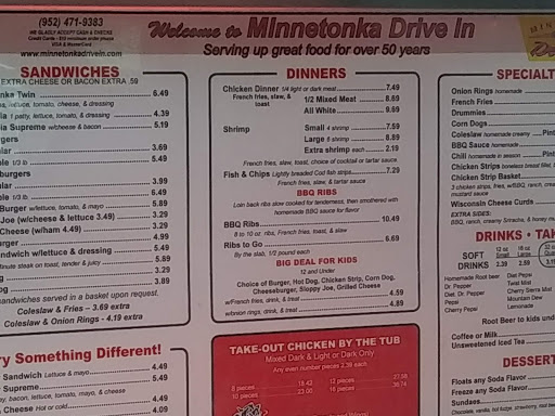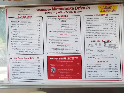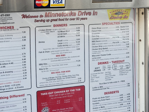 Nice old school drive in. Hot dog, pork tenderloin, and Minnetonka twin burger were all solid. Homemade onion rings were good too, and they serve a&w root beer. We were serenaded by 60s music and had a nice Saturday night dinner.