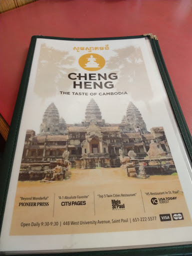 I am Cambodian but born and raised in Saint Paul. Ive been hitting up Cheng Heng since they opened up and we are regulars. The owner/Wife answers the phone with Jill, my Wife, because we are on their caller ID. Im not tight with the owners and give them props for always being friendly, respectful, courteous and fast to us. My Wife likes to chit chat but Im the kind of guy that wants awesome food for a great value and am there to eat and run. The food here is authentic, delicious and is a great value. We usually get egg rolls and chicken wings, perfect for the kids and crunchy and juicy and pho noodle soup, curry chicken with rice or noodle, eggplant curry with chicken, the fried fish, papaya salad, luc lac a beef stir fry and cha kroeng, stir fry...these are usually what we order and our cant miss meals that will be a flavor explosion from the norm. Prices are great and affordable. Parking can be tough if you go during the lunch rush or on a holiday because they are open on most holidays. I can count on one hand where service was not great but the servers are always responsive if you let them know what you need and not enough to give them a bad score, aint no place perfect. If you want a great meal and are on a budget or if you want to have some amazing tasty food that is authentic Khmer food at a local Mom and Pop shop than this is the place for you and yours.