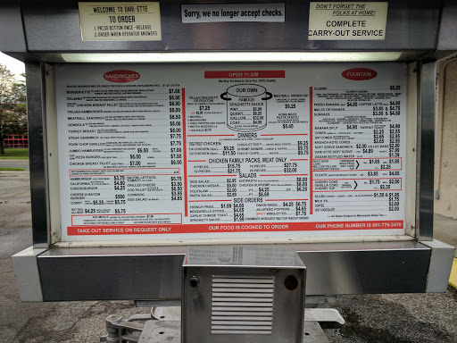 Love Dari-ette, this little Mom & Pop drive-in is much more than burgers, fries and shakes, this place serves up some of the best Italian food in the area, funny thing is, when I was a kid growing up in the area I used to see it when my Dad drove us through the area, but my parents didnt have a lot of money and we never ate out growing up, Years later and after living around the country, I end back up in MN but live 30 miles away from the Dari-ette.. after seeing it on an episode of Diners, Drive-inns and Dives, my wife and me when and checked it out.. Sorry I waited until after I was 50yrs old.. But since they are only a season place, we try and get there once a summer. I think once you try it.. youll be a fan of the Dari-ette also!