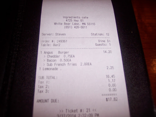 Some of the photos on google are not of Ingredients in White Bear Lake. This restaurant is a cafe within a generic shopping strip, not a fancy cafe in urban Paris as some stock photos suggest. Menu is overpriced for quality of the food/ recipes. It does not compare to other restaurants nearby with the same, high pricing. Its just not exceptional in any way, and sometimes not even good. Then add the fact that its just a normal looking cafe inside, and there is no reason for the high prices. The grill is often too hot-- food gets burned, and the flavors are just not there. Dinner is sometimes accompanied by live music, and that generally brings a loud atmosphere as people try to talk over the music. I think this is a great spot for a few drinks, and maybe an appetizer. I wouldnt plan on a culinary experience, or a romantic night out. Kids meals are priced too high as well, for what they are. Sorry-- wish I could say it is better. Ive given them many chances, and been disappointed many times.