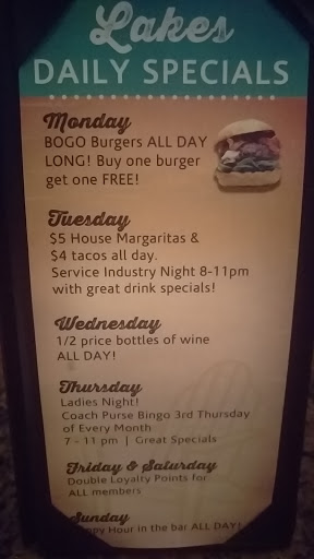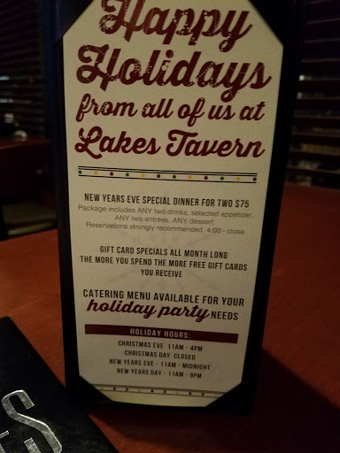 I have eaten at Lakes Tavern several times. Typically there is no waiting for a table. Service is hit or miss. Food is generally poor. I used to be able to get a decent sandwich there but stayed away from the entrees. Lately even the sandwiches have been disappointing and the other dishes Ive tried failed to distinguish themselves. Most recently two people in our party were unable to eat their food because it was over-salted to the point of being inedible. The waiter took the two dishes off the bill but offered no olive branch and the two diners had to go away hungry.